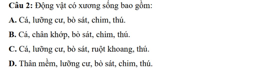 A. Cá, lưỡng cư, bò sát, chim, thú.
