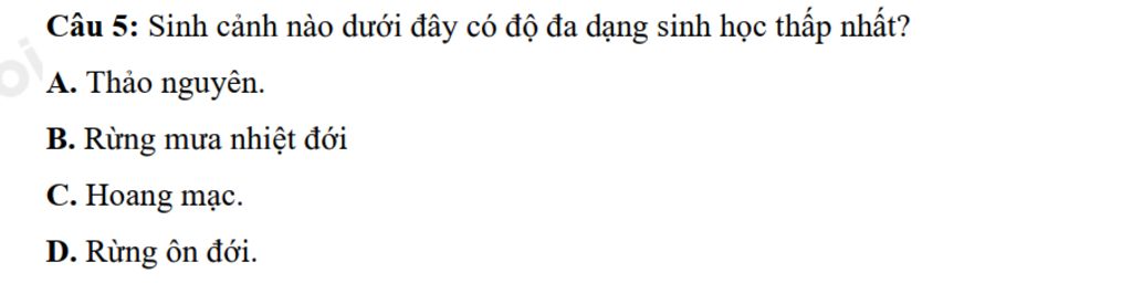 Câu `5:` Sinh cảnh nào dưới đây có độ đa dạng sinh học thấp nhất?
