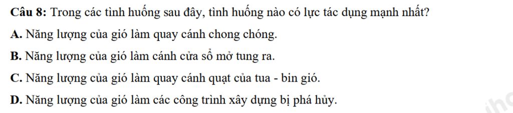 =>vậy đáp án là D.Năng lượng của gió làm các công trình xây dựng bị phá hủy.