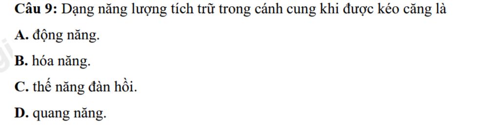 Dạng năng lượng tích trữ trong cánh cung là thế năng đàn hồi bởi khi kéo căng và bắn ra thi cánh cung trở về vị trí ban đầu