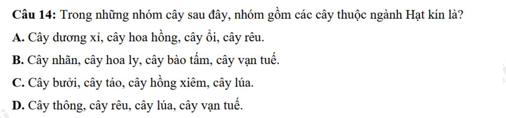 Câu `14:` Trong những nhóm cây sau đây, nhóm gồm các cây thuộc ngành Hạt kín là?