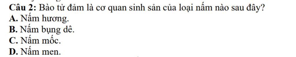 `->bbA`$\\$Nấm men, nấm bụng dê và nấm mốc có cơ quan sinh sản là túi bào tử