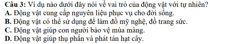 Câu `3:` Ví dụ nào dưới đây nói về vai trò của động vật với tự nhiên?