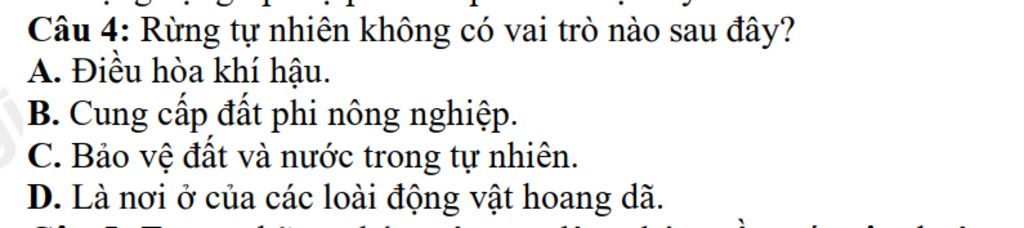 Câu 4: Rừng tự nhiên không có vai trò nào sau đây?