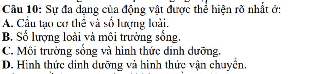 Khái niệm: Đa dạng sinh học được thể hiện bằng nhiều đặc điểm, trong đó có sự đa dạng về số lượng loài, số lượng cá thể của mỗi loài và đa dạng về môi trường sống của sinh vật