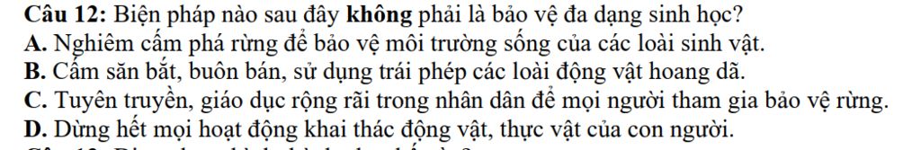 Câu 12: Biện pháp nào sau đây không phải là bảo vệ đa dạng sinh học?