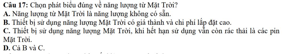 Câu `17:` Chọn phát biểu đúng về năng lượng từ Mặt Trời?