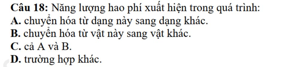 `->``bbC`$\\$Năng lượng hao phí xuất hiện trong quá trình chuyển hóa từ dạng này sang dạng khác và từ vật này sang vật khác