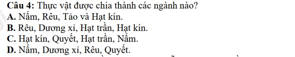 Giải thích: Thực vật chia ra làm 4 ngành là rêu (không có mạch dẫn), dương xỉ (có mạch dẫn, không có hạt), hạt trần (có mạch dẫn, có hạt, không có hoa) và hạt kín (có mạch dẫn, có hạt và có hoa)