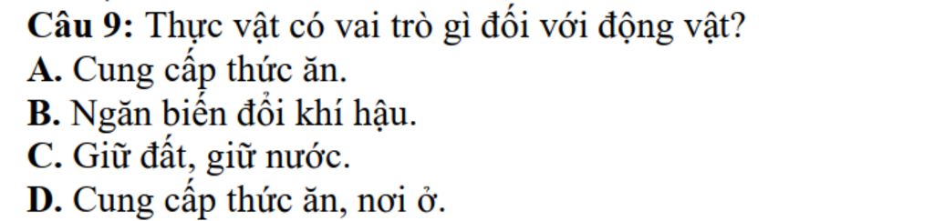 `->``bbD`$\\$Thực vật có vai trò cung cấp thức ăn, nơi ở cho động vật