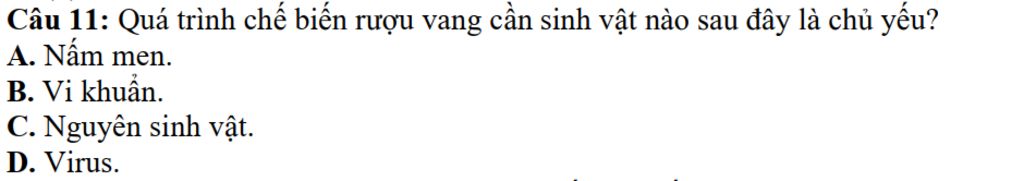 `@`Quá trình chế biến rượu vang chủ yếu dựa vào việc sử dụng nấm men. Men chuyển đổi đường thành cồn và `CO_2` trong quá trình lên men, tạo ra cồn và các hương vị cho rượu vang