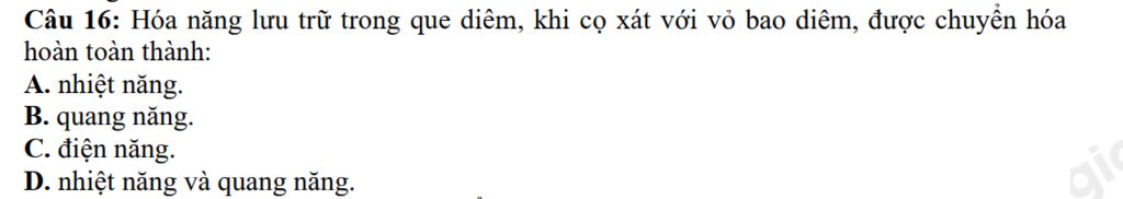 `->``bbD`$\\$Hóa năng lưu trữ trong que diêm, khi cọ xát với vỏ bao diêm, được chuyển hóa hoàn toàn thành nhiệt năng và quang năng