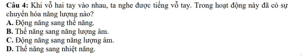 Câu `4:` Khi vỗ hai tay vào nhau, ta nghe được tiếng vỗ tay. Trong hoạt động này đã có sự chuyển hóa năng lượng nào?