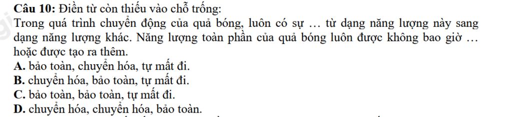 Câu 10: Điền từ còn thiếu vào chỗ trống: Trong quá trình chuyển động của quả bóng, luôn có sự từ dạng năng lượng này sang dạng năng lượng khác. Năng lượng toàn phần của quả bóng luôn được không bao giờ ... hoặc được tạo ra thêm.