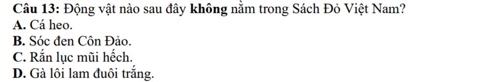 Trong các đáp án, đáp án chứa động vật không nằm trong Sách Đỏ Việt Nam là `D.` gà lôi lam đuôi trắng
