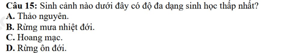 Câu 15: Sinh cảnh nào dưới đây có độ đa dạng sinh học thấp nhất?