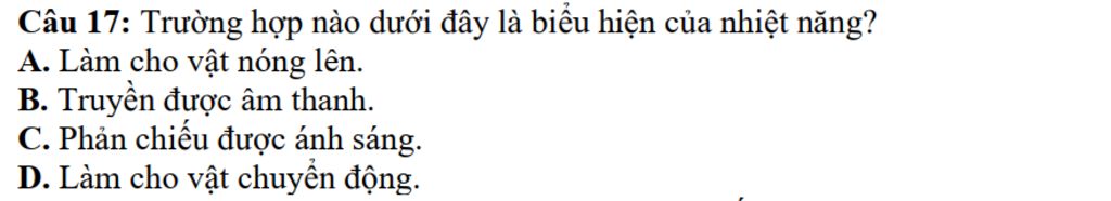 Câu 17: Trường hợp nào dưới đây là biểu hiện của nhiệt năng?