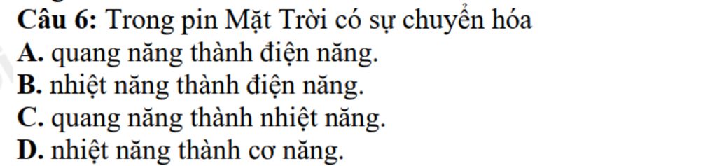 Câu 6: Trong pin Mặt Trời có sự chuyển hóa
