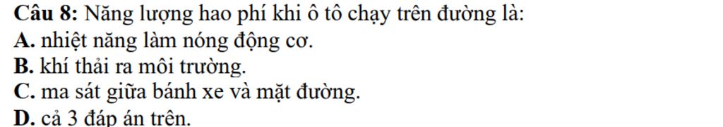`->``bbD`$\\$`1`.Nhiệt năng làm nóng động cơ$\\$`2`.Khí thải ra môi trường$\\$`3`.Ma sát giữa bánh xe và mặt đường