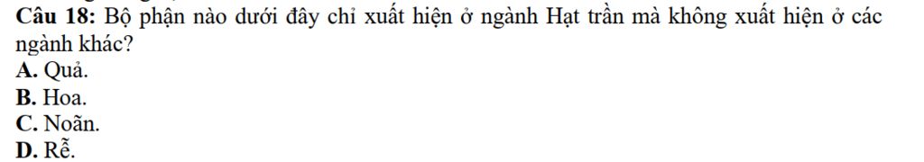 Câu `18:` Bộ phận nào dưới đây chỉ xuất hiện ở ngành Hạt trần mà không xuất hiện ở các ngành khác? `A.` Quả.