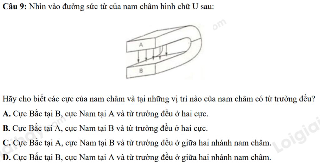 `->` Cực Bắc tại A, cực Nam tại B và từ trường đều ở giữa hai nhánh nam châm.