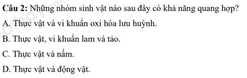 `-` Nhóm sinh vật có khả năng quang hợp: Thực vật, vi khuẩn lam và tảo.
