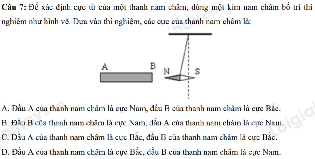 Câu `7`: Để xác định cực từ của một thanh nam châm, dùng một kim nam châm bố trí thí nghiệm như hình vẽ. Dựa vào thí nghiệm, các cực của thanh nam châm là: