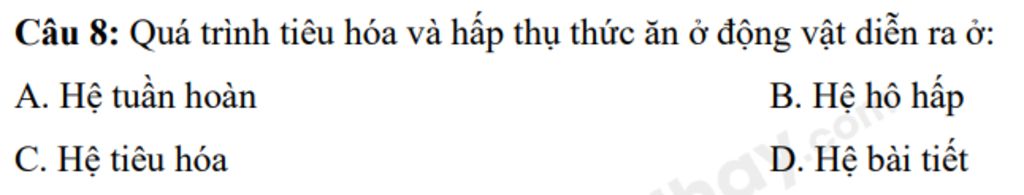 `@` Quá trình tiêu hóa và hấp thụ thức ăn ở động vật diễn ra ở hệ tiêu hóa