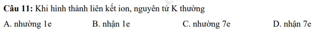 A vì K có 19 nên chỉ cần nhường 1e là có thể trở thành liên kết ion