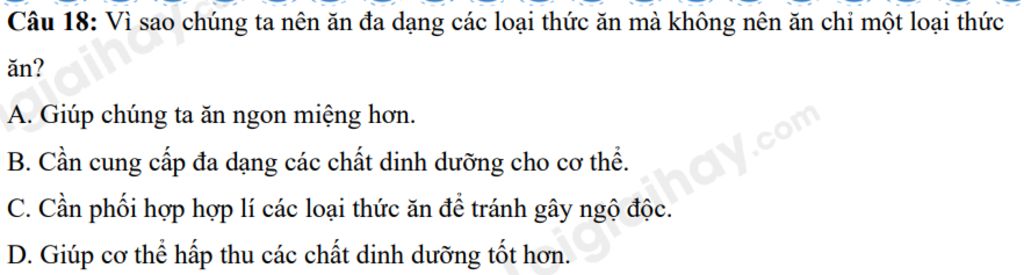 `@` Chúng ta nên ăn đa dạng các loại thức ăn mà không nên chỉ ăn một loại thức ăn dù loại thức ăn đó rất bổ dưỡng vì nếu chỉ ăn một loại thức ăn thì cơ thể sẽ có nguy cơ thiếu hụt chất dinh dưỡng dẫn đến cơ thể sẽ không thể sinh trưởng và phát triển bình thường, thậm chí có thể mắc bệnh tật.
