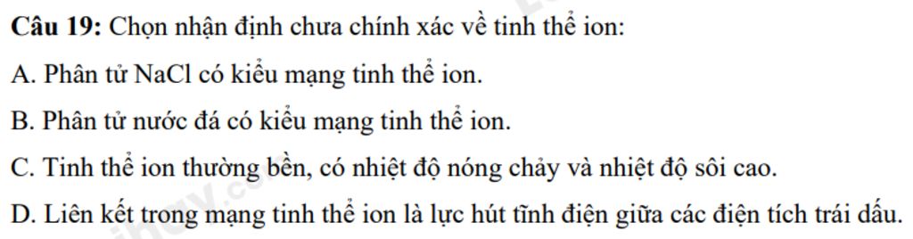 Câu 19: Chọn nhận định chưa chính xác về tinh thể ion: