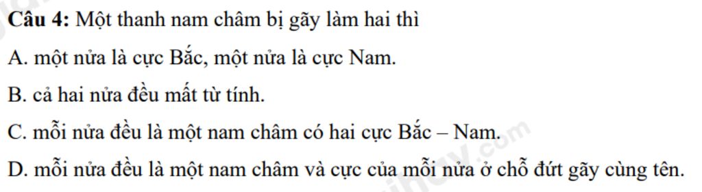 `-` `1` thanh nam châm bị gãy làm hai thì mỗi nửa đều là một nam châm có hai cực Bắc – Nam.