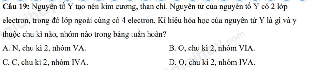 Vậy nguyên tố `Y` nằm ở chu kì `2` nhóm `IVA` trong bảng tuần hoàn