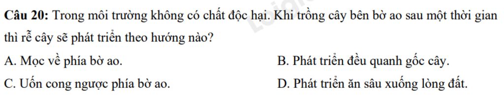 Câu `20`: Trong môi trường không có chất độc hại. Khi trồng cây bên bờ ao sau một thời gian thì rễ cây sẽ phát triển theo hướng nào?