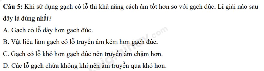 Câu `5:` Khi sử dụng gạch có lỗ thì khả năng cách âm tốt hơn so với gạch đúc. Lí giải nào sau đây là đúng nhất?