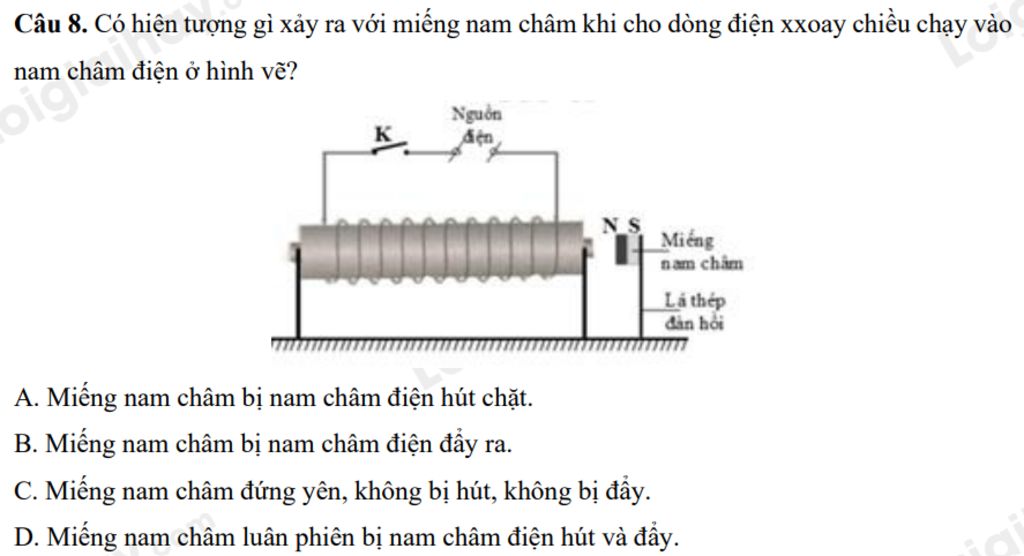 `-` Khi có dòng điện xoay chiều chạy trong nam châm điện thì mỗi khi dòng điện đổi chiều thì nam châm đổi từ cực. Do đó miếng nam châm liên tục bị nam châm điện hút, đẩy (dao động).