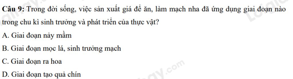 `@` Vì giá đỗ, mạch nha hay rau mầm đều là giai đoạn cây con sau khi hạt nảy mầm. Trong đời sống, việc sản xuất giá để ăn, làm mạch nha đã ứng dụng giai đoạn nảy mầm trong chu kì sinh trưởng và phát triển của thực vật.