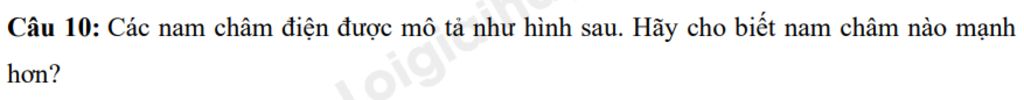Câu `10` : Các nam châm điện được mô tả như hình sau. Hãy cho biết nam châm nào mạnh hơn?