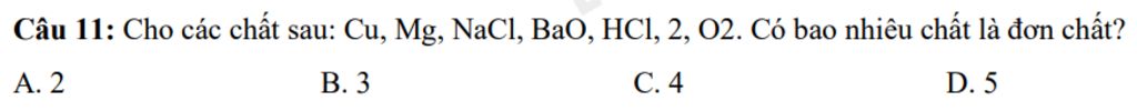 Trong các chất Cu, Mg, NaCl, BaO, HCl2, O2 có 3 đơn chất là Cu, Mg, O2 `=>` Chọn C