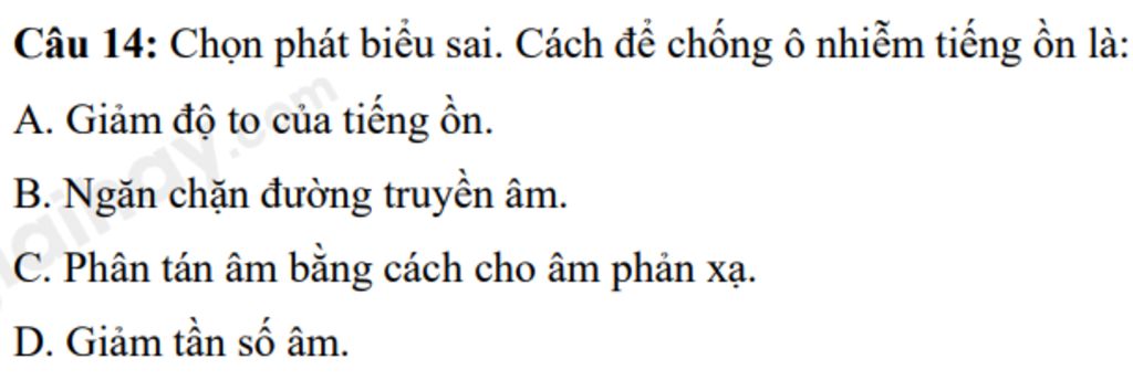 Câu 14: Chọn phát biểu sai. Cách để chống ô nhiễm tiếng ồn là: