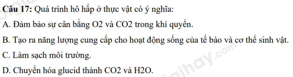 `-` Quá trình hô hấp ở thực vật có ý nghĩa: tạo ra năng lượng cung cấp cho hoạt động sống của tế bào và cơ thể sinh vật.