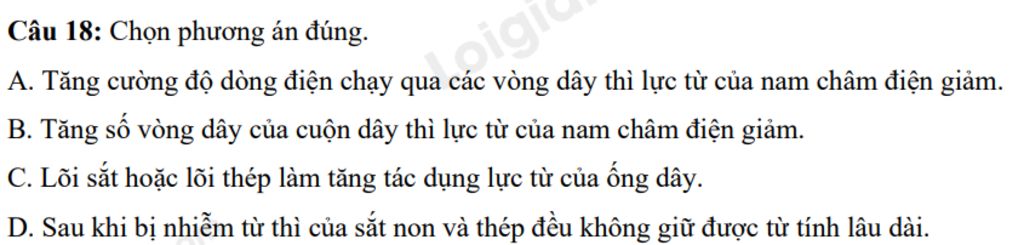 `A.` Tăng cường độ dòng điện chạy qua các vòng dây thì lực từ của nam châm điện giảm.