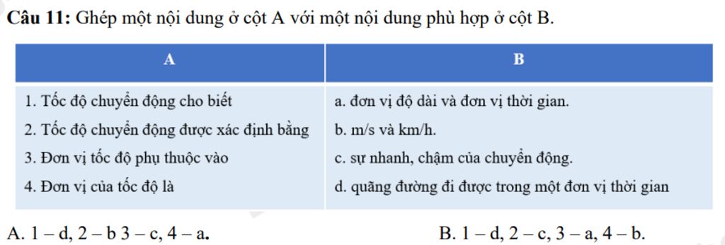 `+` `4` `–` `b`: Đơn vị của tốc độ là m/s và km/h.
