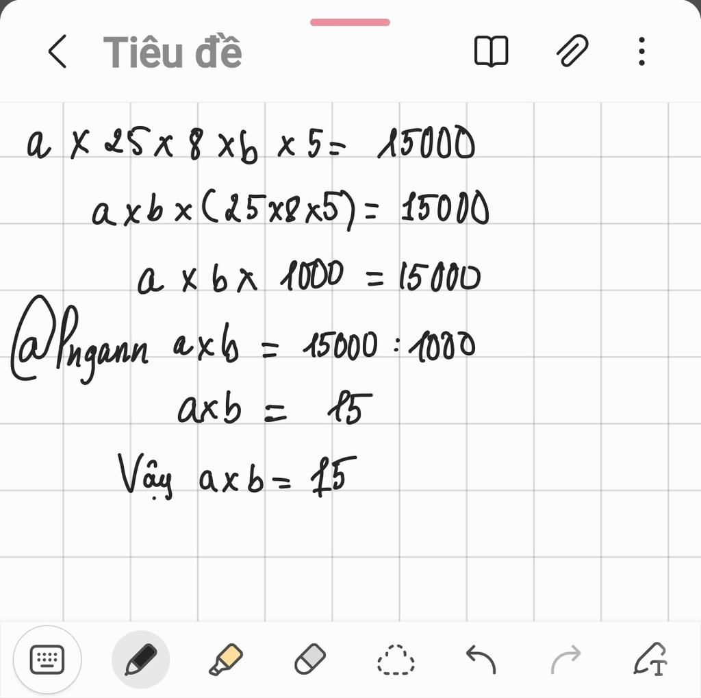 Biết a×25×8×b×5=15000. Khi đó a×b bằng bao nhiêu?