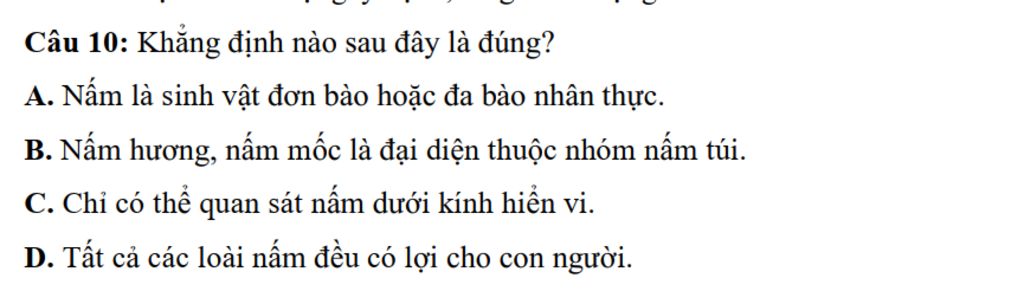 `-` Nấm là sinh vật đơn bào hoặc đa bào nhân thực. `→` Đúng