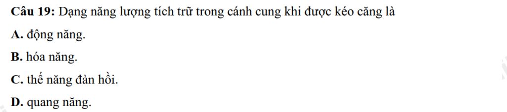 Dạng năng lượng tích trữ trong cánh cung khi được kéo căng là thế năng đàn hồi vì lúc này cánh cung không có hình dạng như ban đầu (hay bị biến dạng)