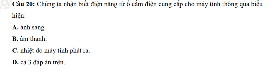 Chúng ta nhận biết điện năng từ ổ cắm điện cung cấp cho máy tính thông qua biểu hiện: