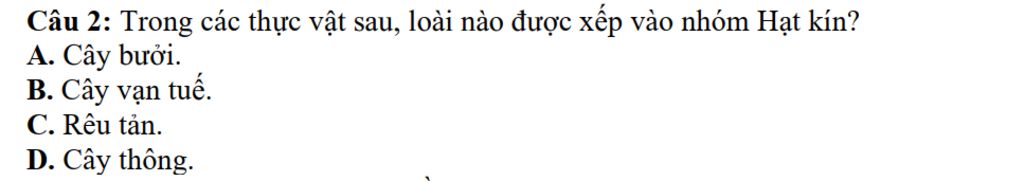 `D` cây thông có nón `=>` thuộc ngành hạt trần