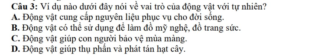 Câu 3: Ví dụ nào dưới đây nói về vai trò của động vật với tự nhiên?