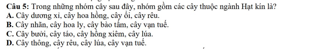 Câu 5: Trong những nhóm cây sau đây, nhóm gồm các cây thuộc ngành Hạt kín là?